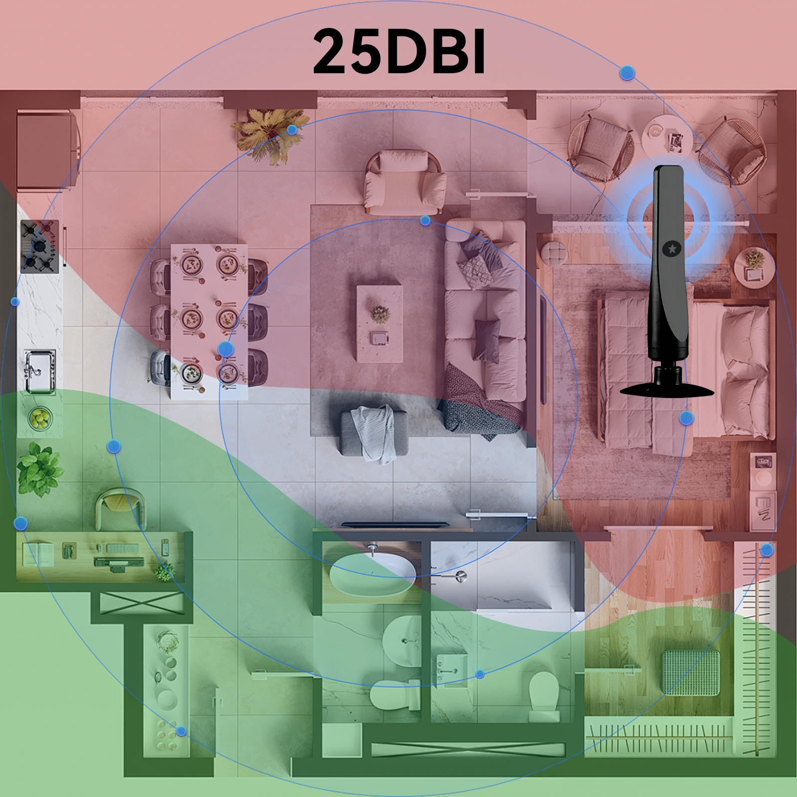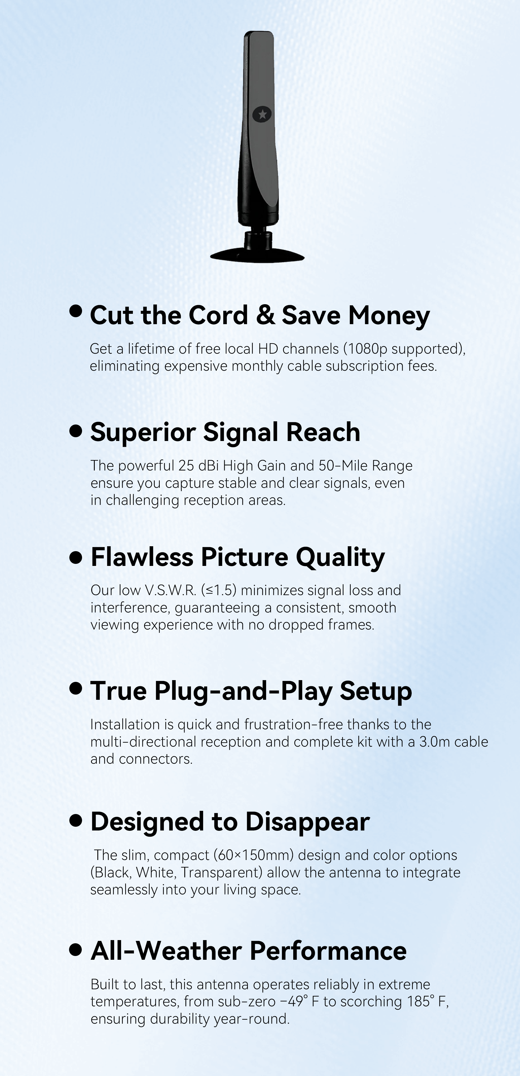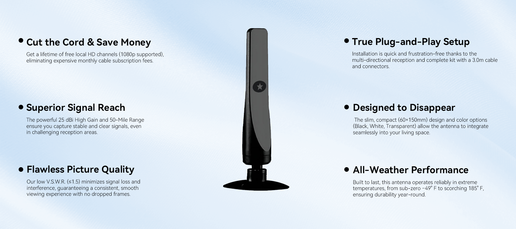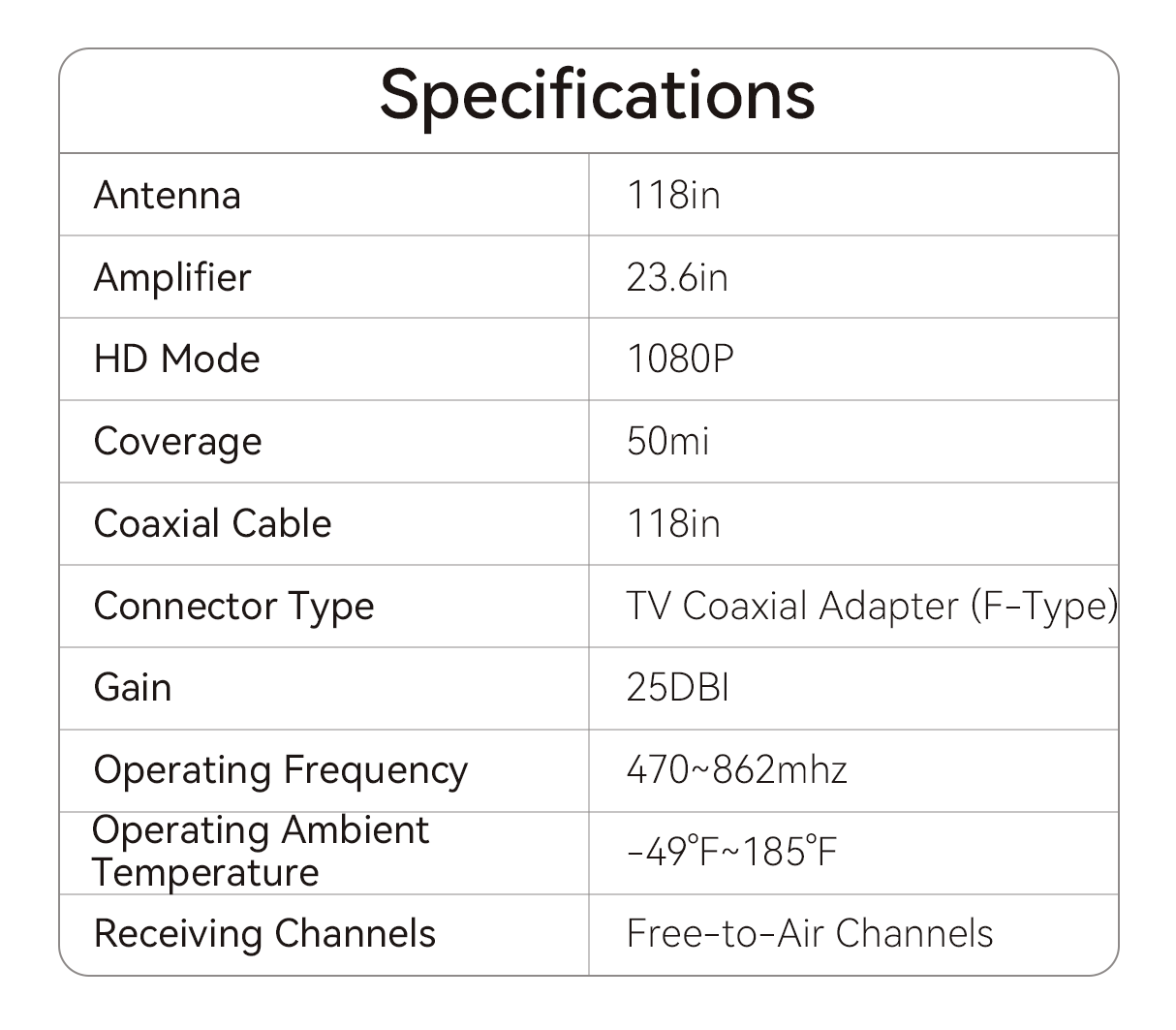 - 25DBI Gain: Enhanced signal strength for clearer images and sound.